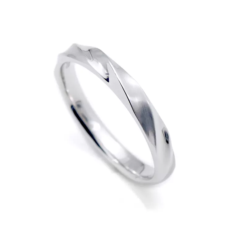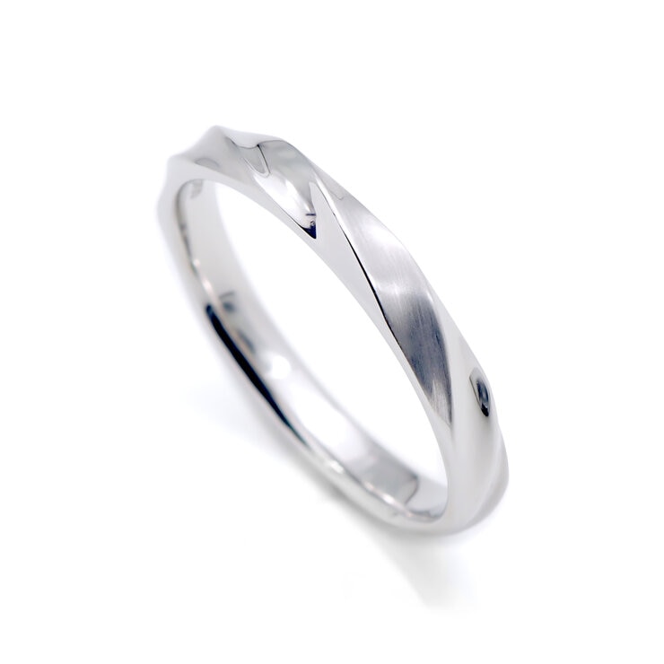 表面はミラー仕上げ(一部ヘアライン)、全体にひねり模様を入れた、上品ながらも個性ある華やかな印象のリングです。