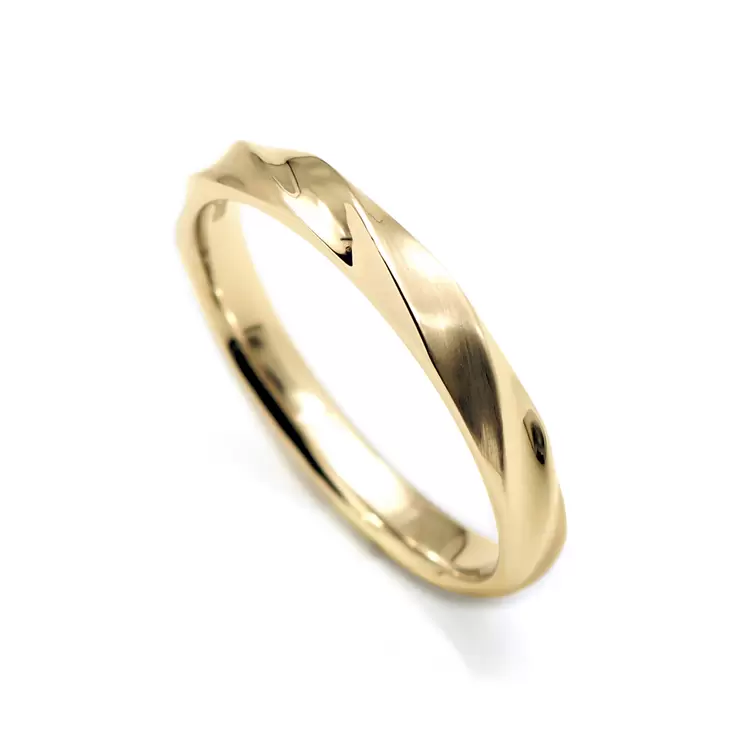 表面はミラー仕上げ(一部ヘアライン)、全体にひねり模様を入れた、上品ながらも個性ある華やかな印象のリングです。