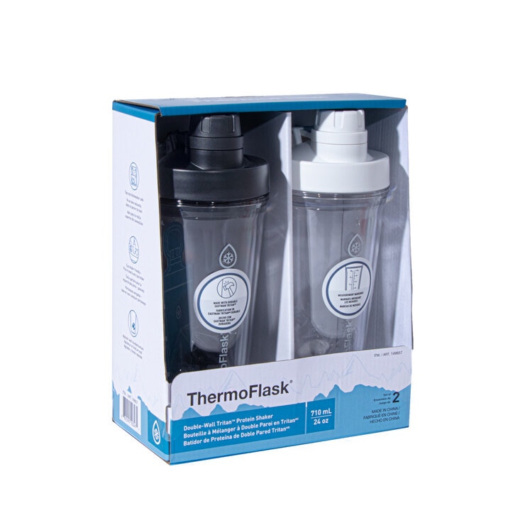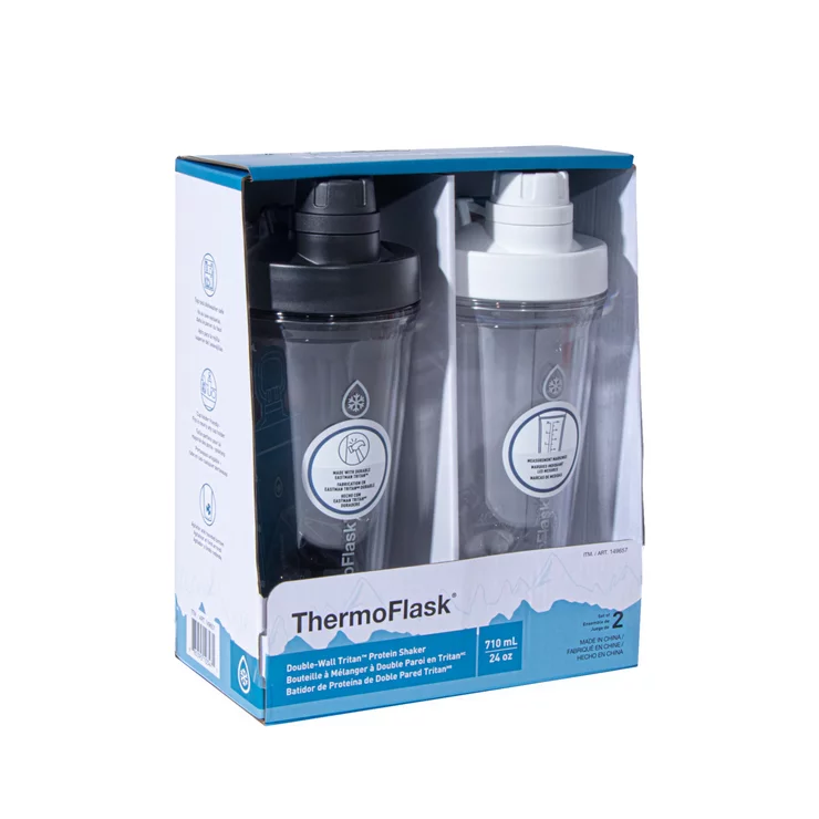 ThermoFlask 24オンス プロテインシェイカーは、カップホルダーに収まるスタイリッシュなデザインで、外出先でも手軽にシェイクを楽しめます。特許取得済みのナイロン製アジテーターがプロテインパウダーを滑らかに混ぜ合わせ、目盛りで正確な分量を計り、丸みを帯びた底で混ぜやすく、お手入れも簡単です。耐久性の高い二重壁Tritan™素材で作られているため、結露することなく飲み物を長時間冷たく保ちます。持ち運びに便利なループハンドルは、ジムやオフィスへ向かう際にも、手軽に持ち運べます。さらにBPAフリーなので、安心してお飲みいただけます。