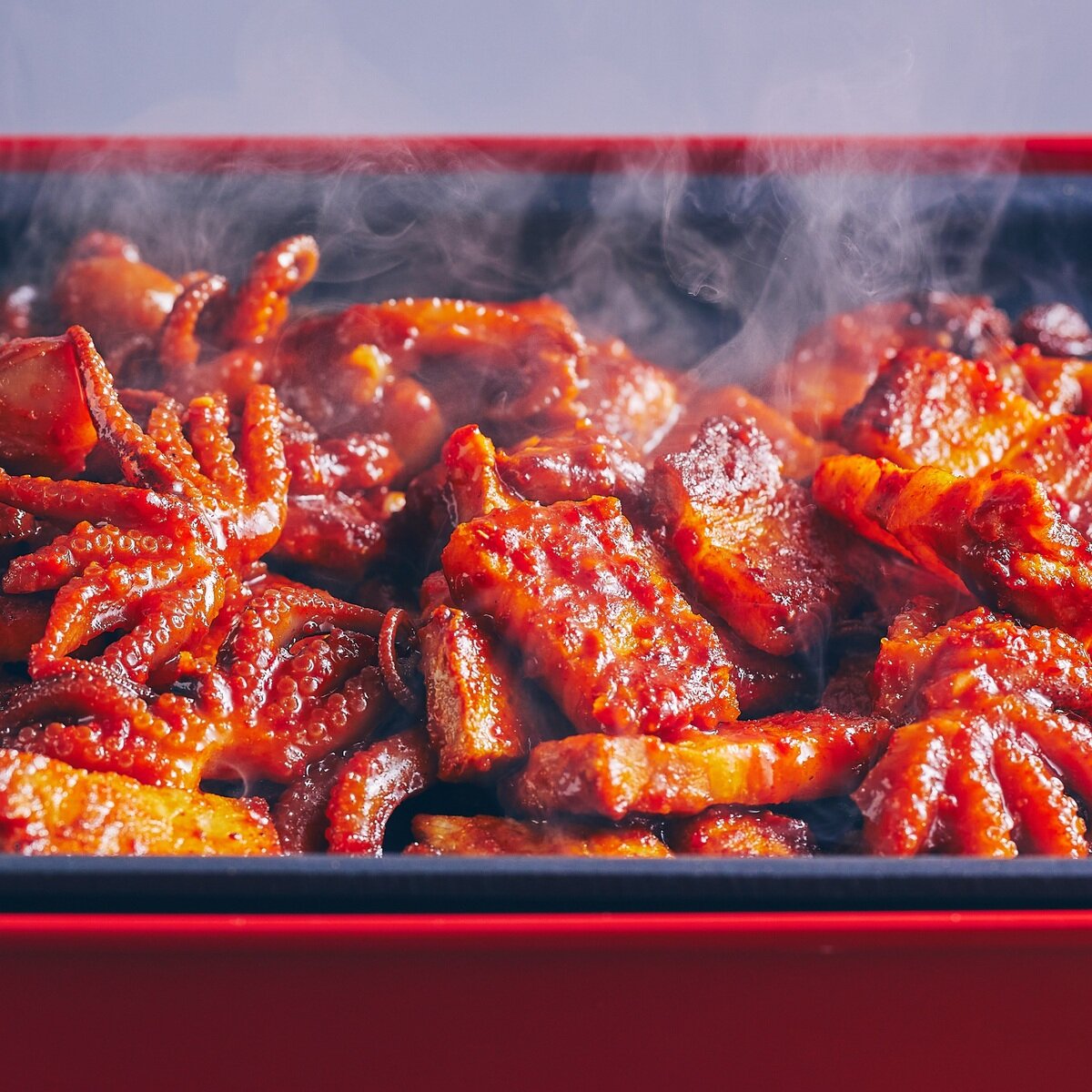 - 本場韓国ではもちろん日本でも専門店が出来るほど人気のチュクミ焼きは、辛めに味付けしたぷりぷりのイイダコを鉄板で炒める韓国料理。ピリ辛のチュクミとサムギョプサルの旨みを合わせると絶品です!!最後の〆にはご飯を投入してタレを絡めながら炒めるピリ辛チャーハンもおすすめです。