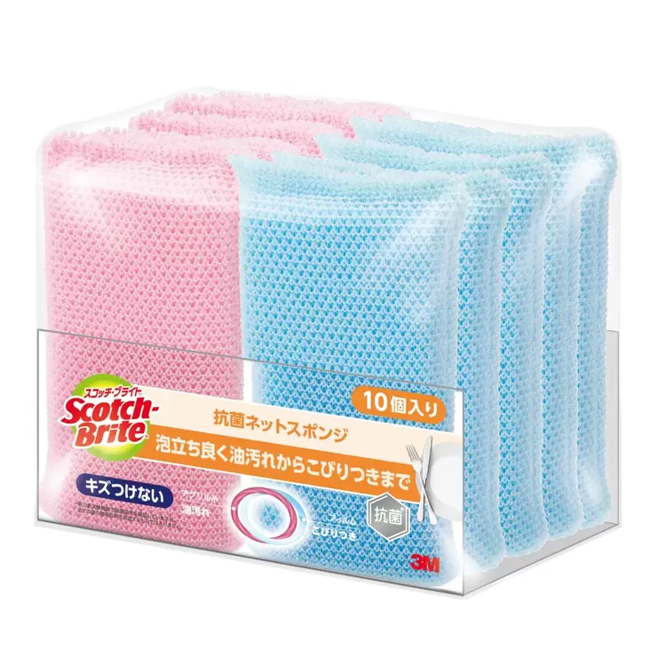 スコッチブライトのキッチン抗菌ネットスポンジです。泡立ちよく油汚れからこびりつきまでスッキリ落とします。