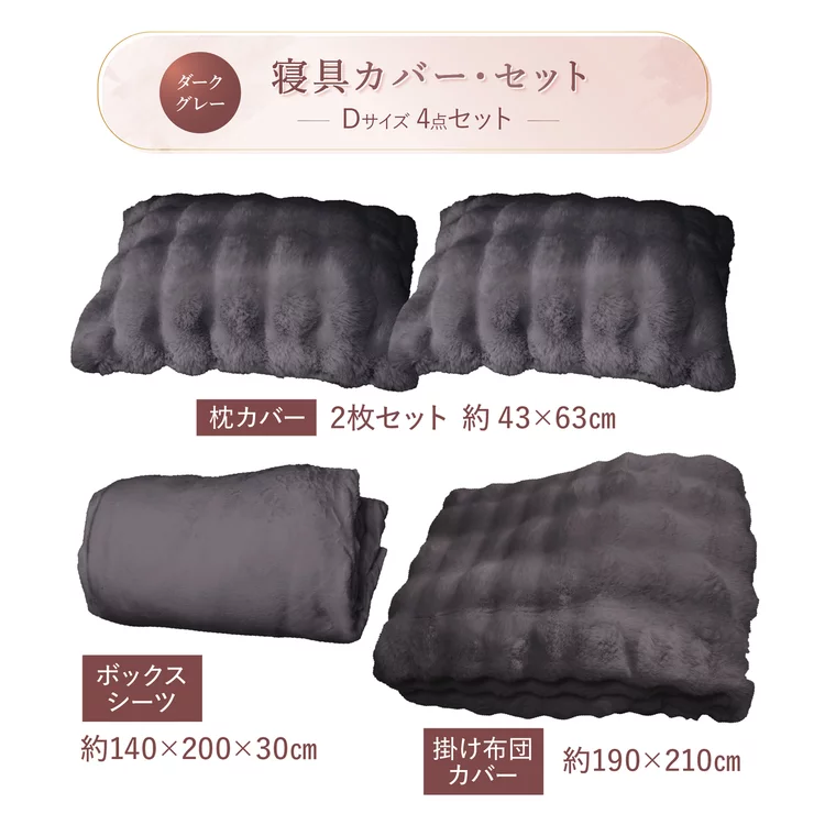 4点セットの内容[Dサイズ 掛け布団カバー(約190×210cm)ボックスシーツ(約140×200×30cm)枕カバー2枚(約43×63cm)