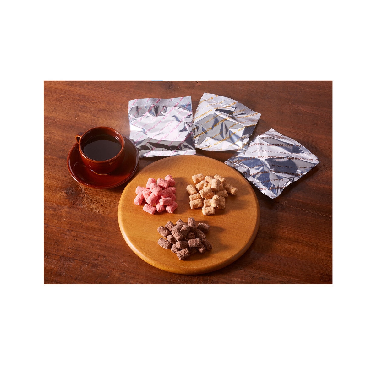 ひとくちサイズのマシュマロをミルクチョコレート、ストロベリーチョコレート、キャラメルチョコレートでコーティング。