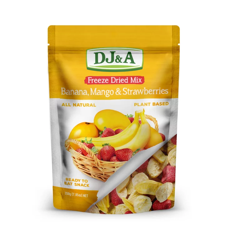 DJ&A フリーズドライミックス バナナ & マンゴー&ストロベリーは、そのまま食べられるスナックです天然の植物由来で、食物繊維が豊富です。人工着色料、香料、保存料は使用していません。