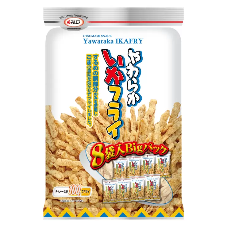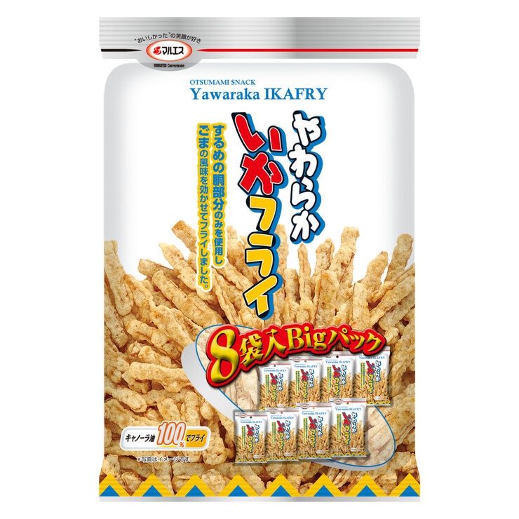 するめの胴部分のみをキャノーラ油で揚げた、ソフトタイプのいかフライです。風味豊かな味わいは、おつまみにも、お子様のおやつにもピッタリです。