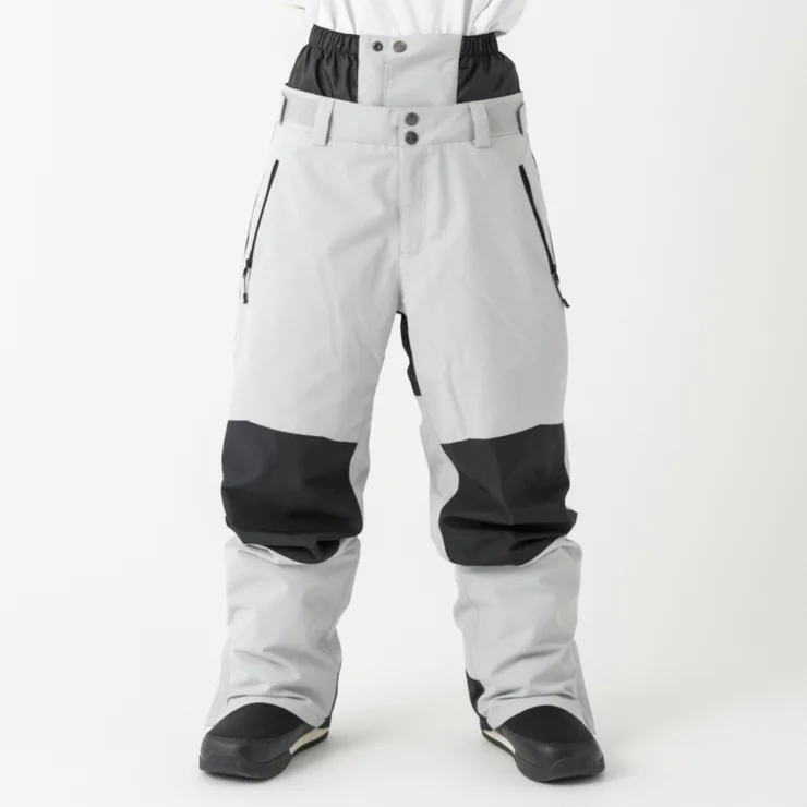 程よいワイドシルエットで、ニュアンスカラーのベースと膝、お尻、裾後ろを黒で切り替えしたシンプルなデザイン
