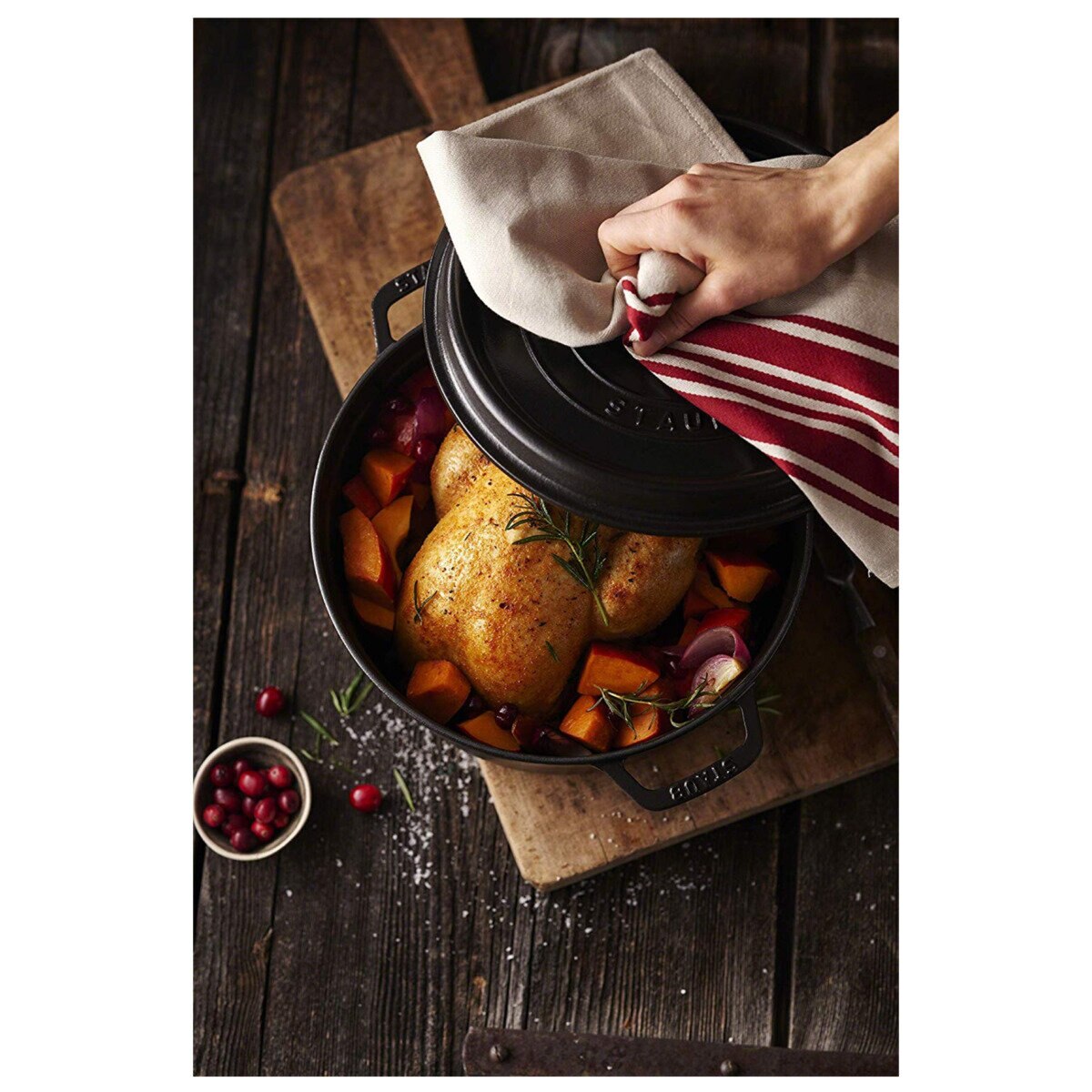 ココット内部はすべてストウブ独自のザラザラ加工。細かな凹凸によって表面積が増えるため油なじみがよく、食材との接点が少なくなり焦げ付きにくい仕様。ガラスを原料とするエマイユ(ホウロウ)加工は食材の酸にも強く、長時間使用における臭い移りを防止。薄く3層に渡って施したストウブのエマイユ加工はプロユースにも耐えうる抜群の耐久力。
