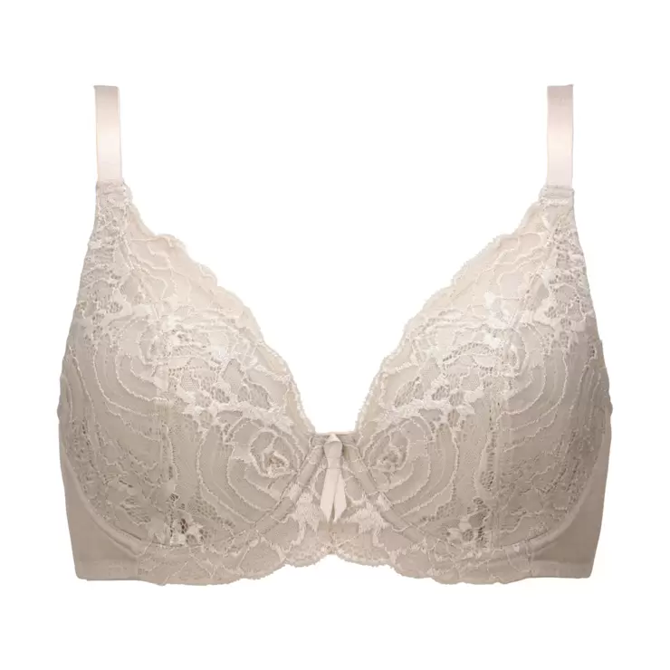 カップサイドについたパーツがバストの横流れを防止、深めのカップとレースがバスト全体を覆うので、大きいバストの方も自然でキレイなバストラインへ