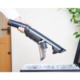 片手でリリースボタンをつまむだけで強力なハンディに。家具上や狭い場所のお掃除も、気づいた時にサッと取ってサッと使えます。ボタンを押すだけでゴミ捨てが簡単。ゴミも飛び散りづらく、手を汚すことなく衛生的です。