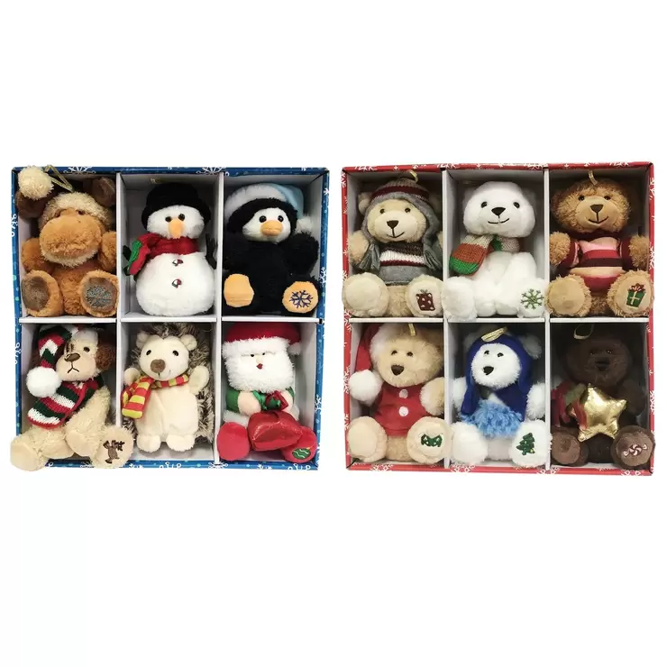 - ニットのセーター、帽子、マフラーでおしゃれをした可愛らしいぬいぐるみのオーナメントです。