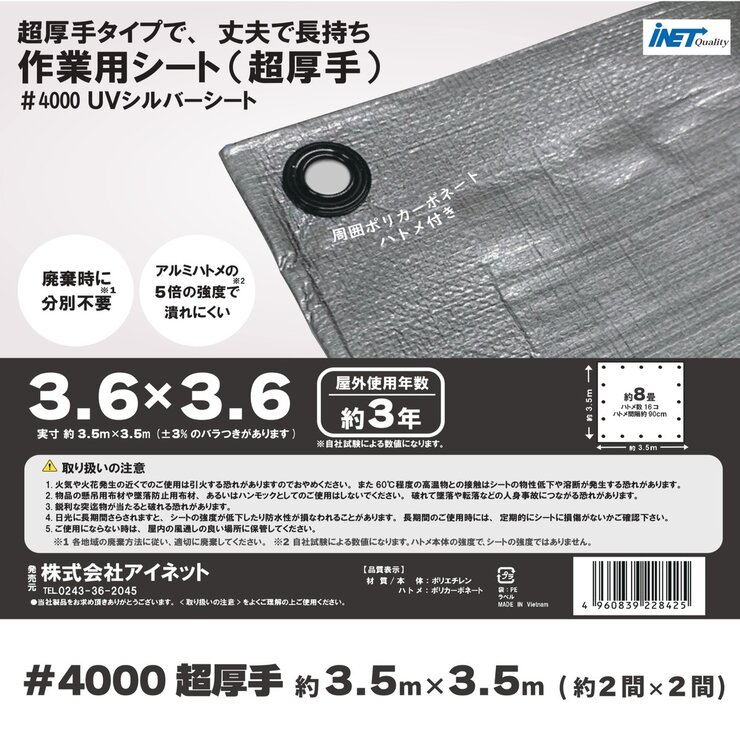 アイネット #4000高耐候性UVシルバーシート 3.6 x 3.6m