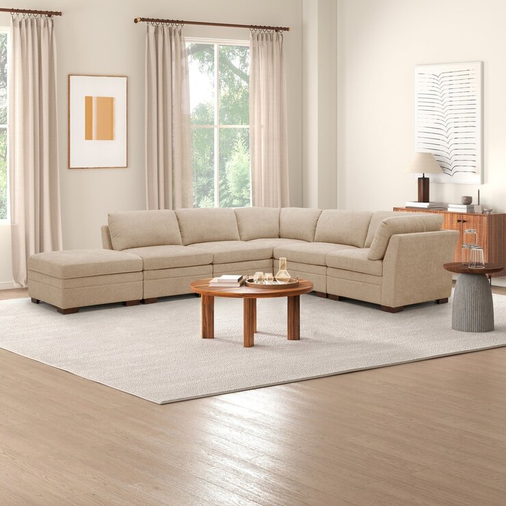 スタイリッシュで広々とした、適応性の高いこの6ピース・セクショナルソファは、どんなリビングスペースも格上げするデザインです。洗練された印象のソフトタッチファブリック張りのこのモジュラーセクショナルは、お部屋のレイアウトやライフスタイルに合わせて複数の配置が可能です。サポート力のある多密度のフォームのシートクッションと無垢材の脚が、快適さと耐久性の両方を提供します。おそろいの収納オットマンが便利さをプラスし、くつろぎのスペースを広げ、必需品を見えないところにすっきりと収納できます。おもてなしにも、くつろぎのひとときにも、このセクショナルチェアはあなたの家にふさわしい柔軟性と洗練さをお届けします。