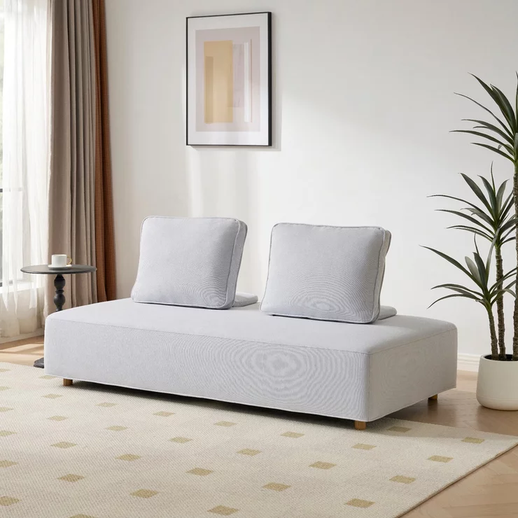 シンプルで洗練されたデザインのソファです。自由に動かせる背もたれが2つ装備されており、必要に応じて調整可能です。背もたれを取り外すことで、ソファベッドとしても使用できます。