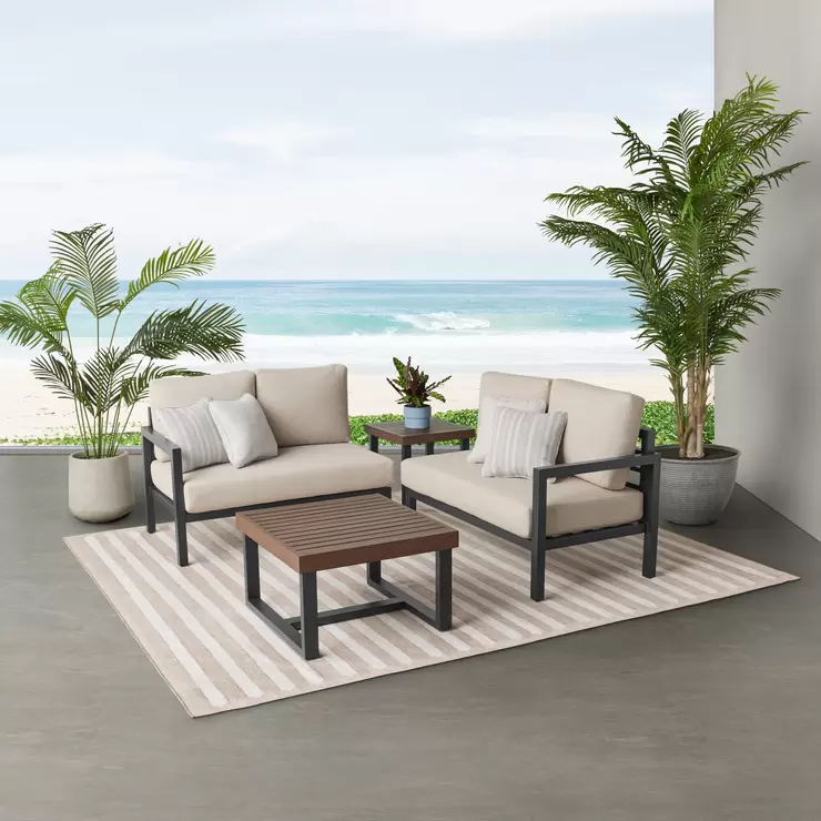アジオ Trinity 屋外用 ソファー 4点セットは、屋外に素晴らしいデザイン、快適さ、価値を提供します。一つ一つハンドペイントされたアルミニウムフレームは美しい見た目に仕上がっています。紫外線、汚れに強い Sunbrella® クッションのおかげで、天候を気にすることなくご使用いただけます。Resysta®テーブル天板は再生材(籾殻)を約60%使用し、メンテナンス不要で天然木のような高級感と見た目を維持します。配置を変えることでカスタマイズが可能で、屋外空間を自分の好みに合わせて作り変えることができます。