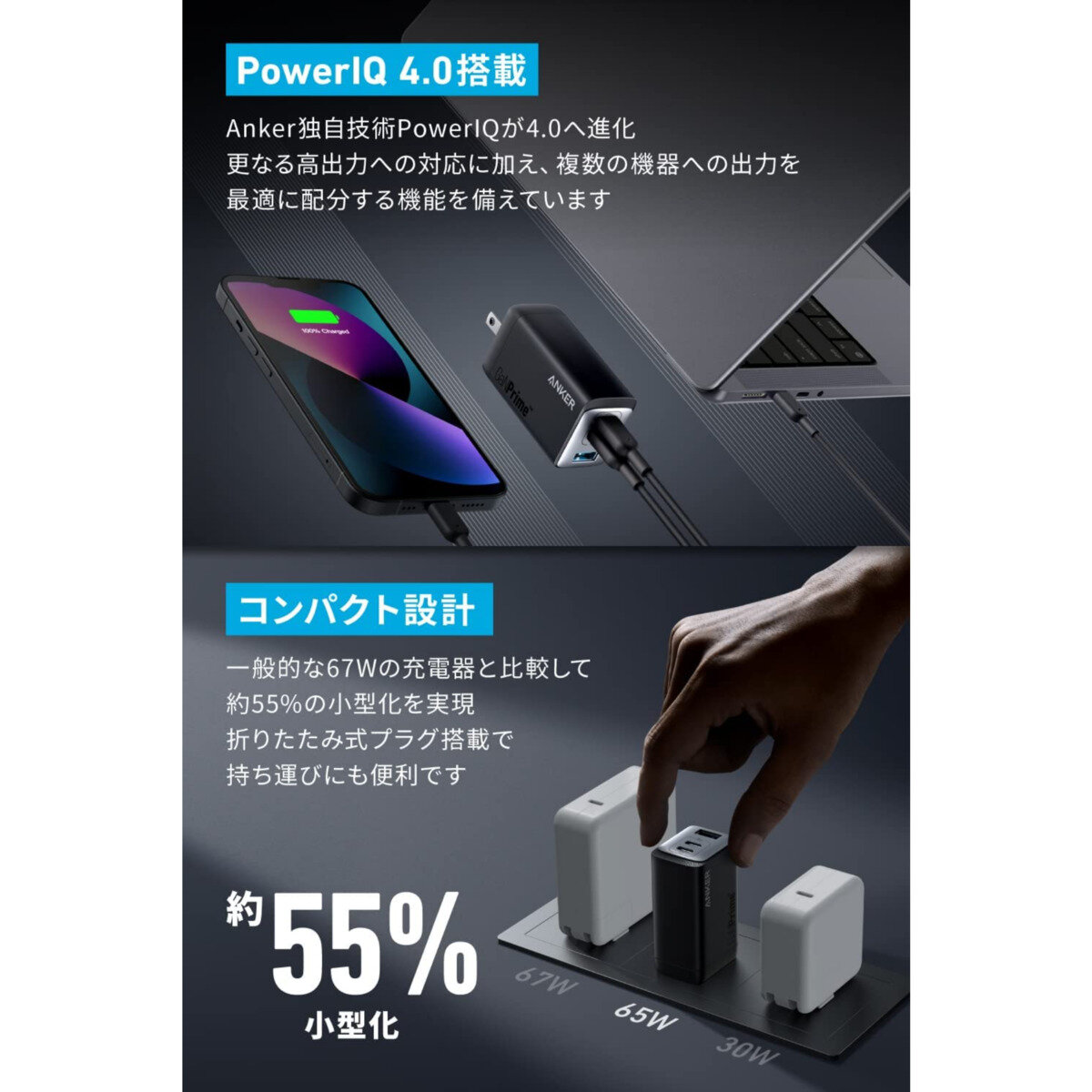 Anker独自技術「GaNPrime」を採用し、GaN搭載充電器が前シリーズから進化 超高出力 & 小型化に成功しながら複数ポートへの充電の最適配分と更なる安全性も実現しました。