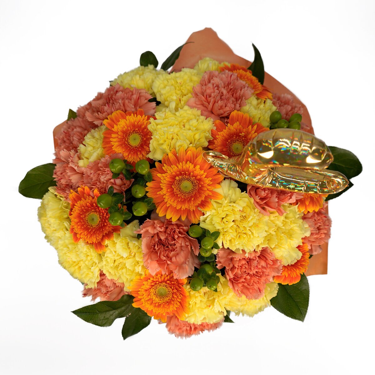 カーネーションをたっぷりと使用し、全体を黄色でまとめたアレンジメントです。
