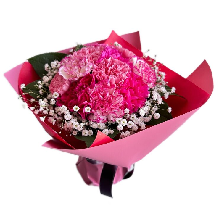 カーネーションの周りをカスミソウでかわいく囲んだブーケです。