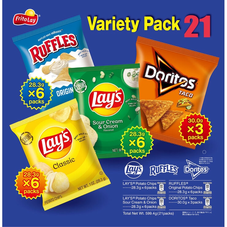 - 内容量: Lay's しお味×6袋、Lay's サワークリーム&オニオン味×6袋、Raffles しお味×6袋、Doritos タコス味×3袋