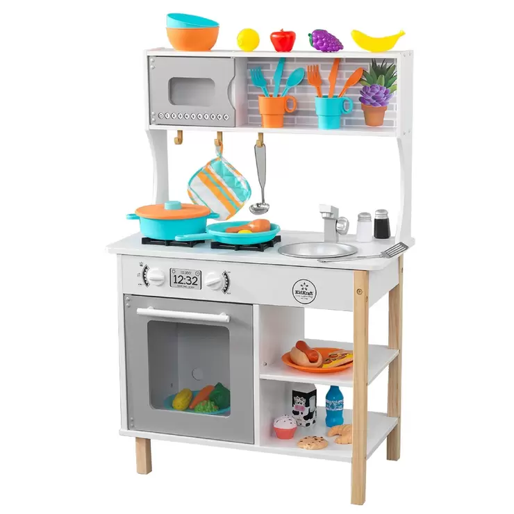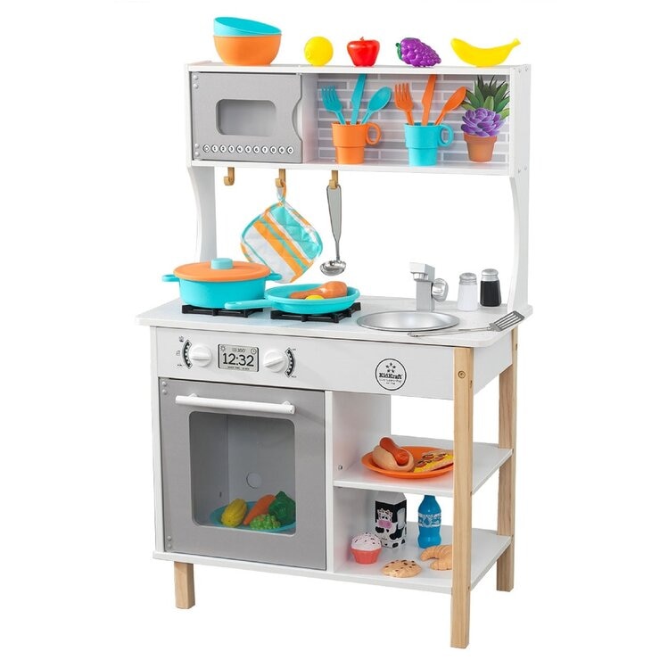 シンプルでたくさんの食器類が付いているキッチンセットに子どもたちは夢中になること間違いなし!