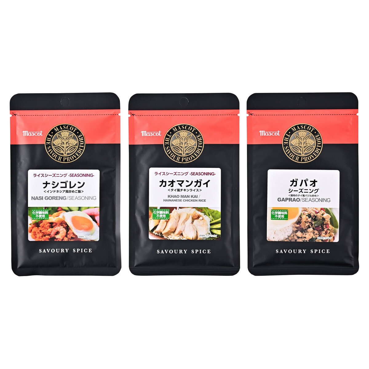 ・人気ご飯『ガパオ』『カオマンガイ』『ナシゴレン』が手軽に作れる、3種類のアジアンライス用のシーズニングセットです。