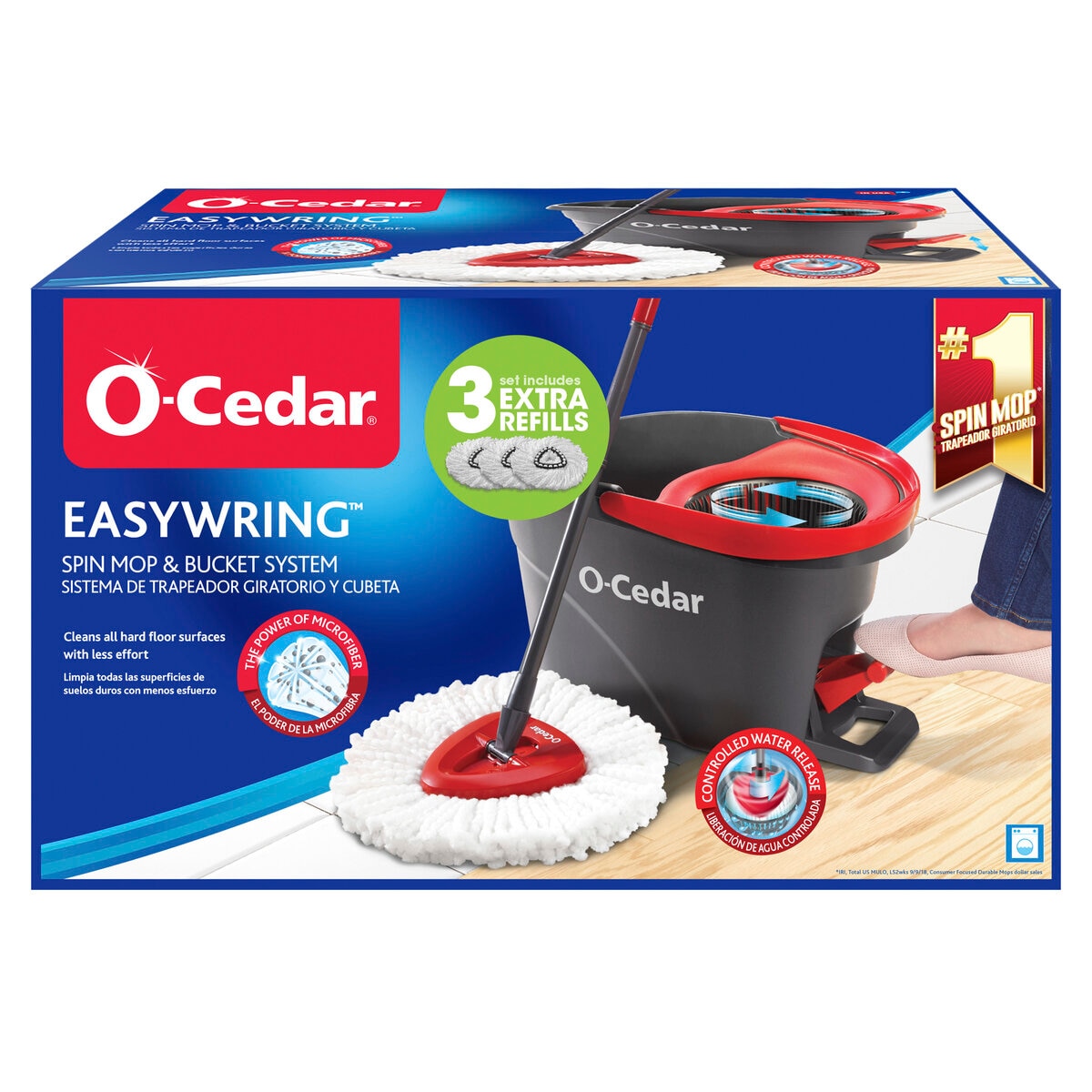 5.バケツ下部の赤いレバーを足で踏むと回転部分が回りだし、モップが回転して水を絞ります。