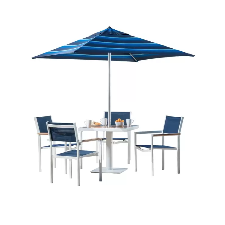 4つのスタッキングチェアとテーブル、アンブレラの6点セット。