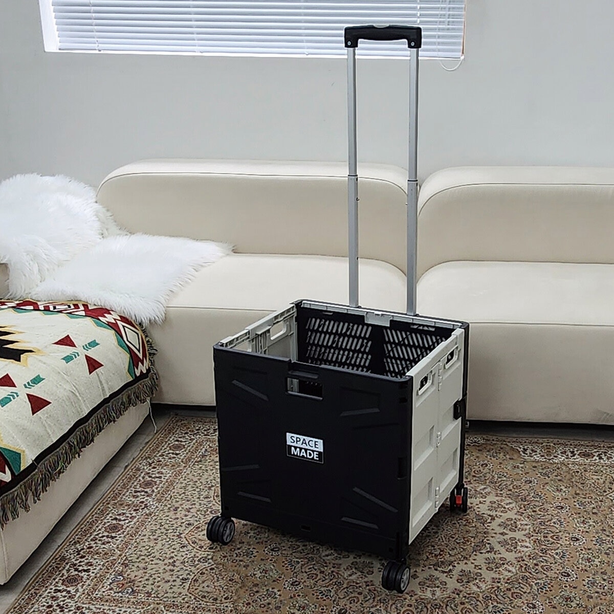 お買い物やレジャーシーンに最適な折りたたみ可能なキャリーカートです。