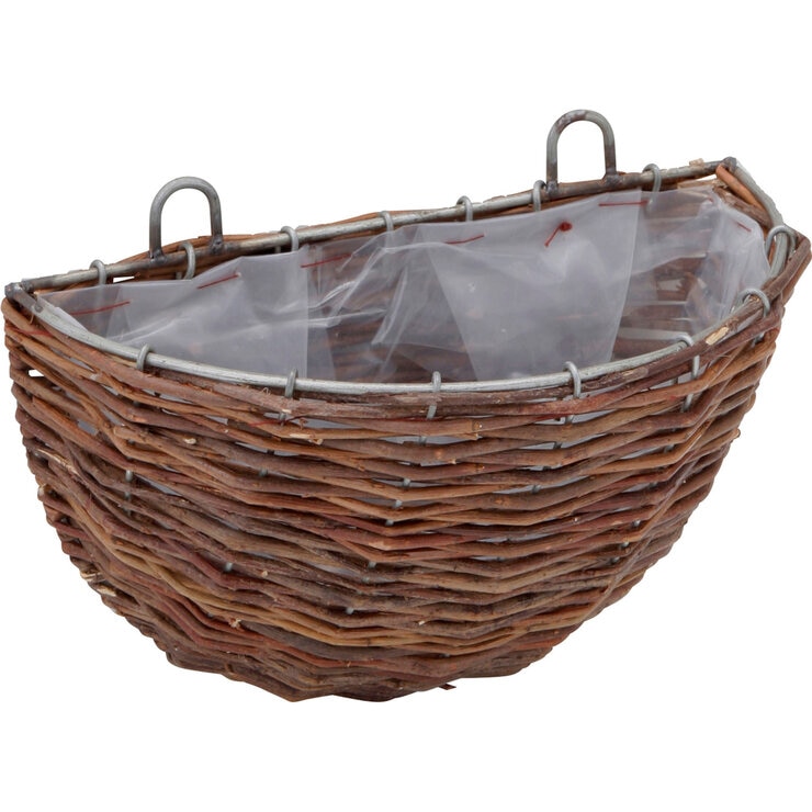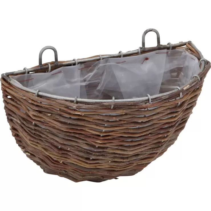 ラタンを編み込んだバスケット。寄せ植えに便利な壁掛けタイプです。